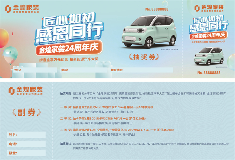 貫穿始終的“老帶新抽盲盒”活動,以現金與材料減免的雙重驚喜搭建情誼橋梁;新能源汽車大獎持續引爆參與熱情。廿四載春秋,金煌裝飾以毫厘精工雕琢安居夢想,用赤子之心回報社會信任。這場跨越兩個月的溫情之旅,正成為見證城市變遷、傳遞民生溫度的生動實踐。