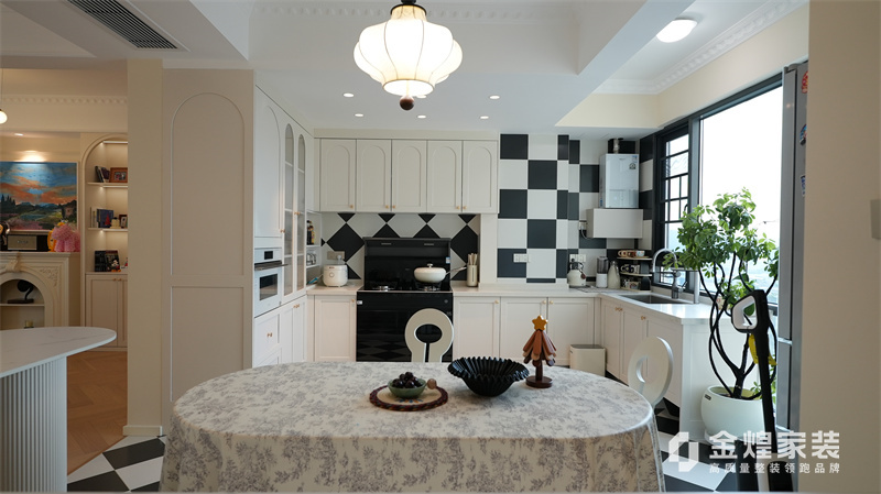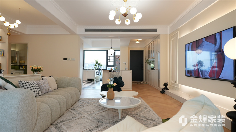 該案例整體色調柔和淡雅,家具造型簡約,線條流暢,同時融入了一些法式元素,如精致的吊燈、優(yōu)雅的拱形門洞和浪漫的裝飾細節(jié),既保留了法式風格的浪漫與優(yōu)雅,又兼具現(xiàn)代簡約的簡潔與實用。