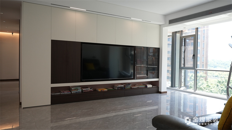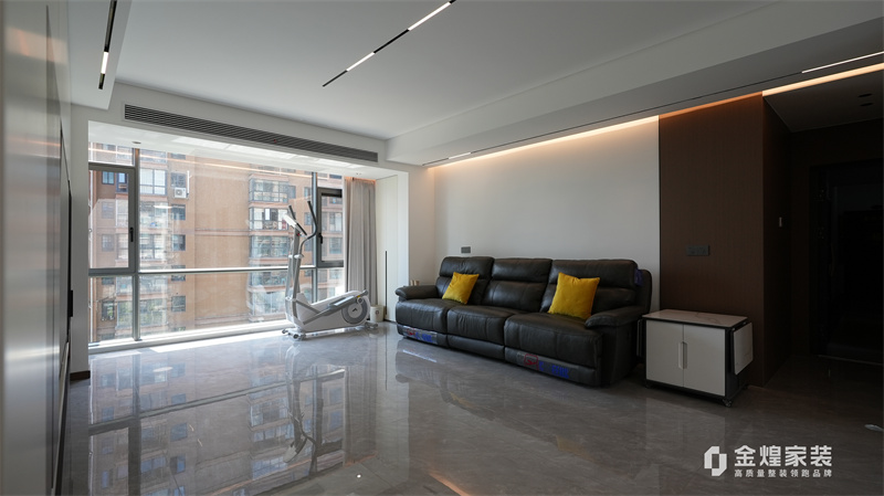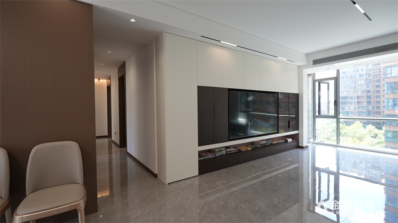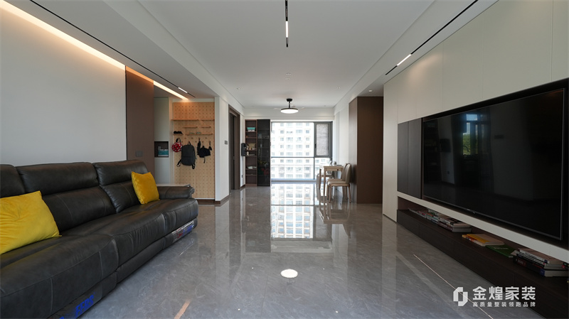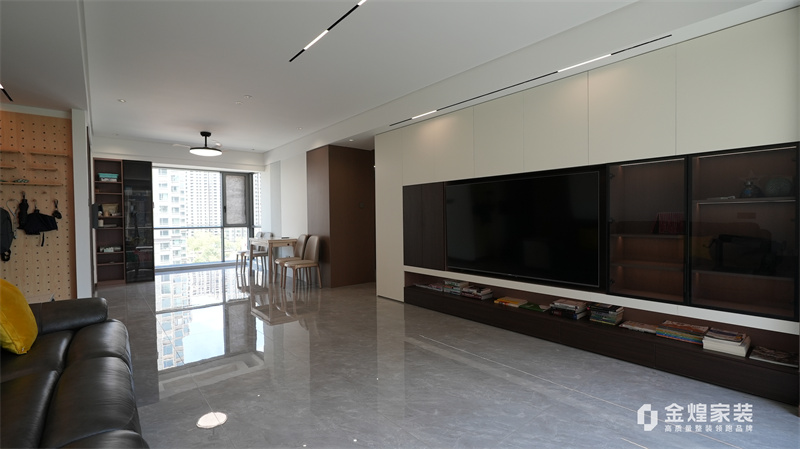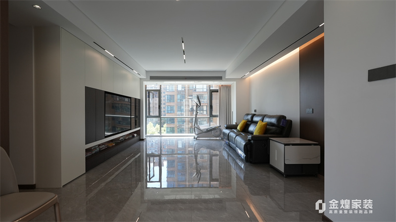 整體色調以黑白灰為主,簡潔明快,沒有過多的裝飾,體現了現代意式風格的特點。客廳的布局開闊,家具的選擇也以簡約為主,如黑色皮質沙發、簡潔的電視柜等,都符合現代人的審美。