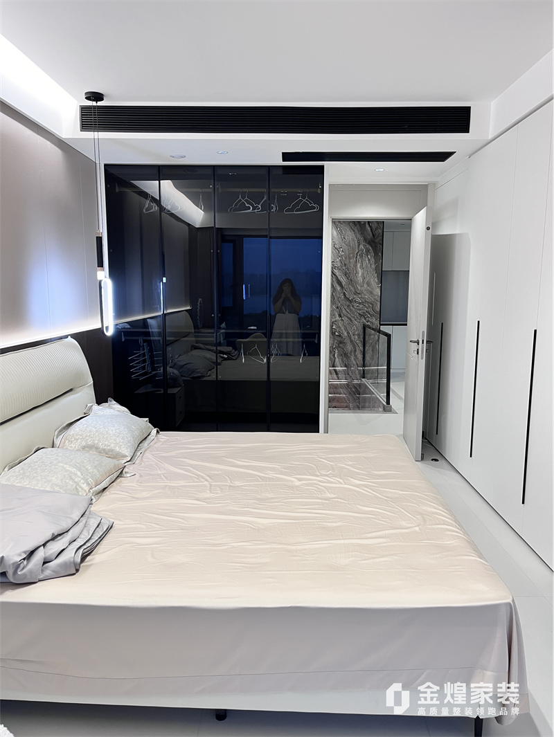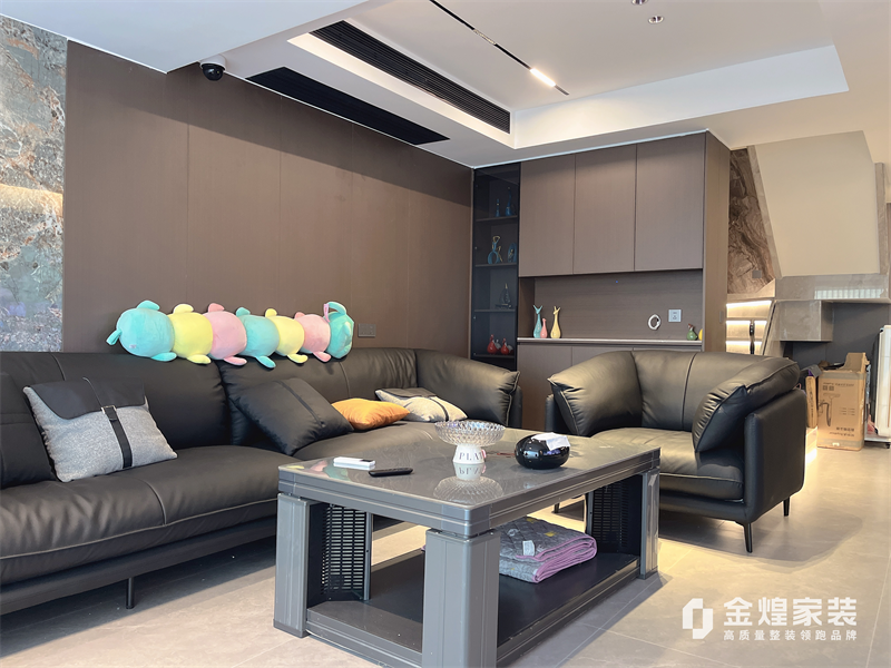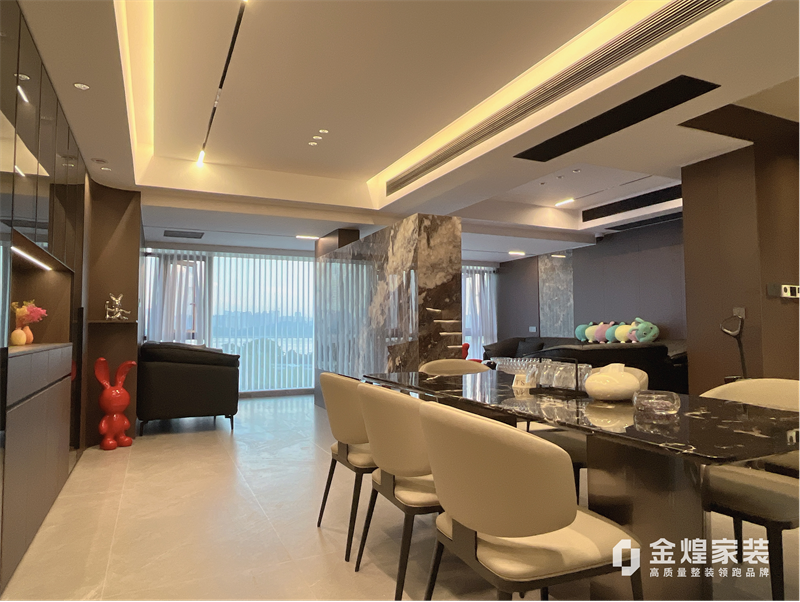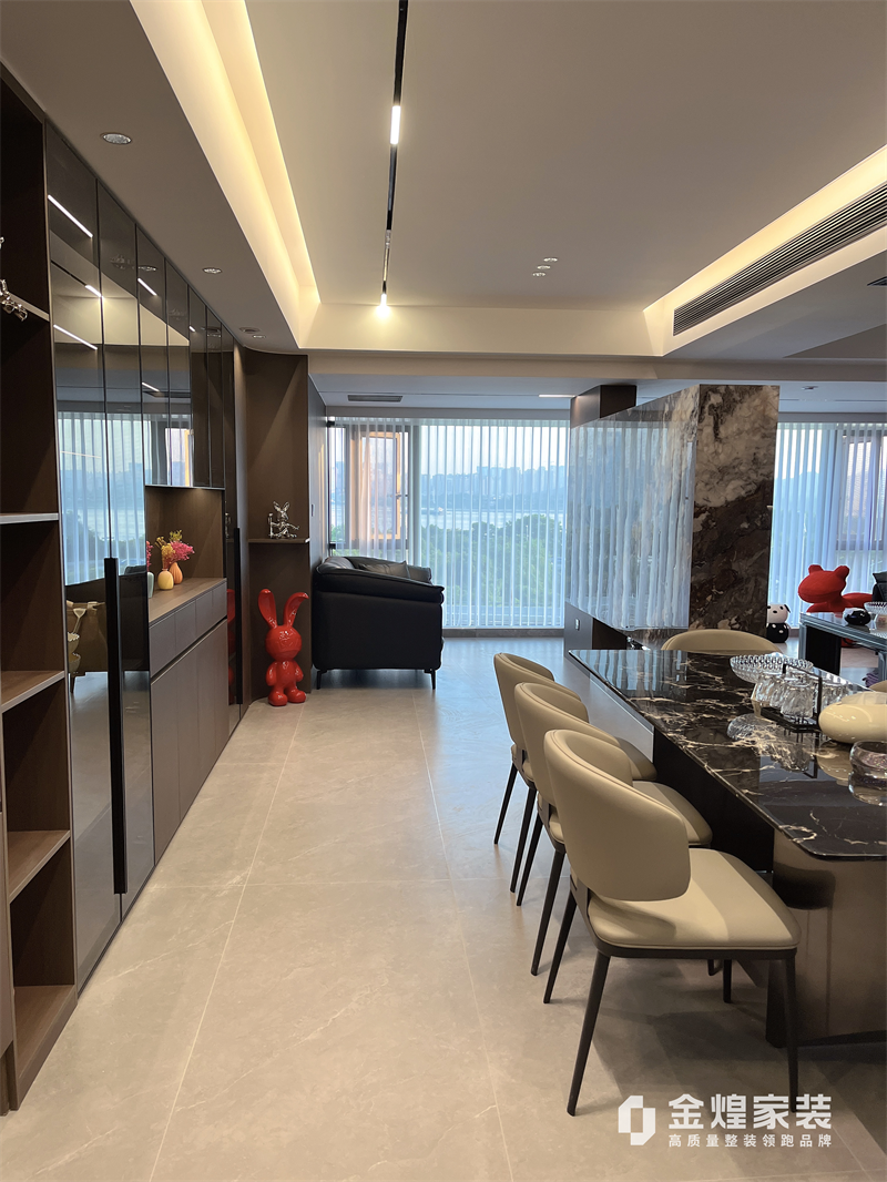 整體色調(diào)偏冷色,家具選用深色家具讓空間更有層次。地面采用750*1500瓷磚通鋪,讓有限空間顯得更敞亮。