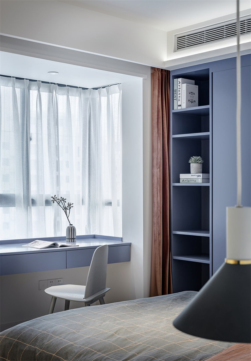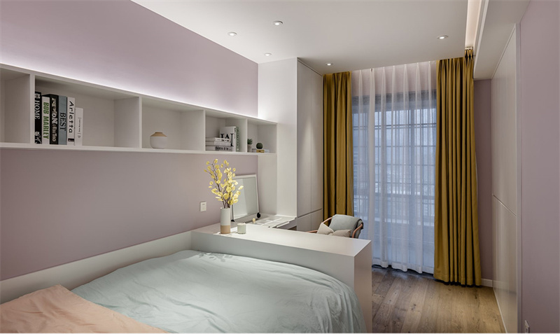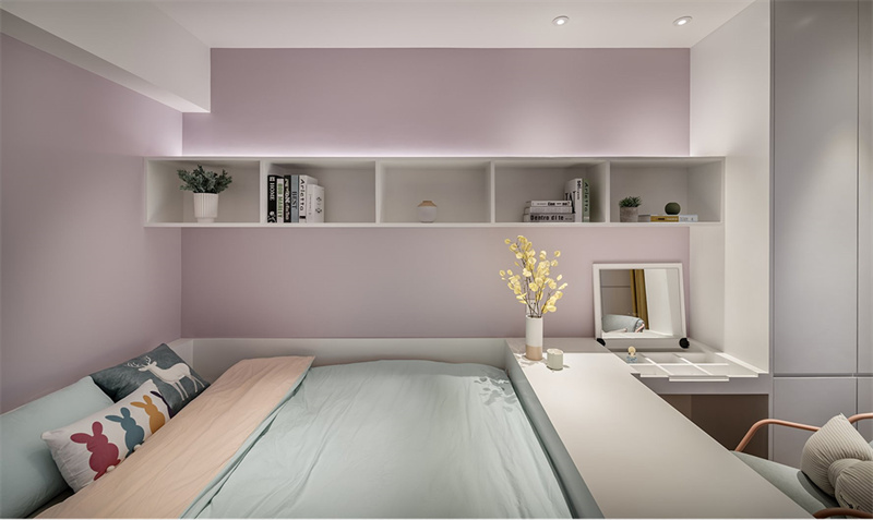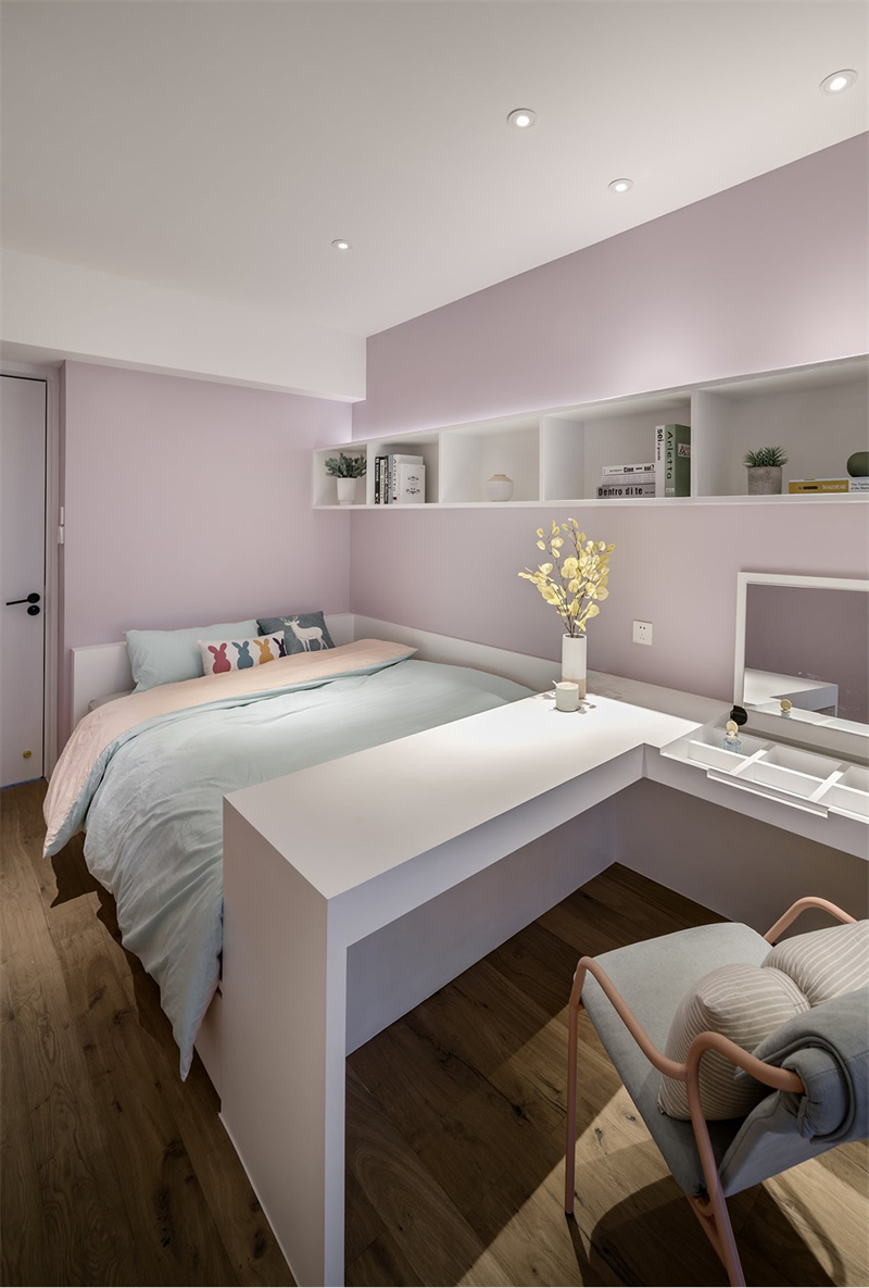 兒童房采用粉色+白色組合做主導(dǎo)色調(diào)。房間一角設(shè)計(jì)了L型書(shū)桌和椅子,既節(jié)省空間又功能齊全,為孩子提供了理想的作業(yè)和學(xué)習(xí)區(qū)域。書(shū)桌上擺放著裝飾品和書(shū)籍,體現(xiàn)了主人對(duì)細(xì)節(jié)的關(guān)注與品味的追求。
