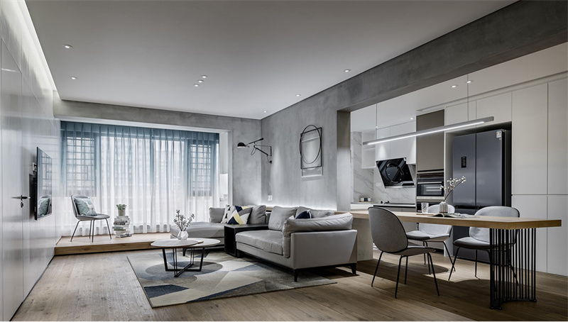 客廳空間灰色水泥墻面與木質(zhì)地板的巧妙搭配,營(yíng)造出一種自然而又不失時(shí)尚的氛圍。寬敞的落地窗設(shè)計(jì)讓充足的自然光線(xiàn)灑滿(mǎn)整個(gè)房間,透過(guò)輕盈的藍(lán)色窗簾,帶來(lái)明亮而通透的視覺(jué)享受。