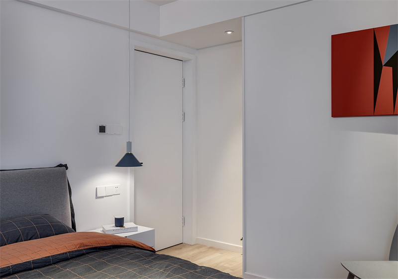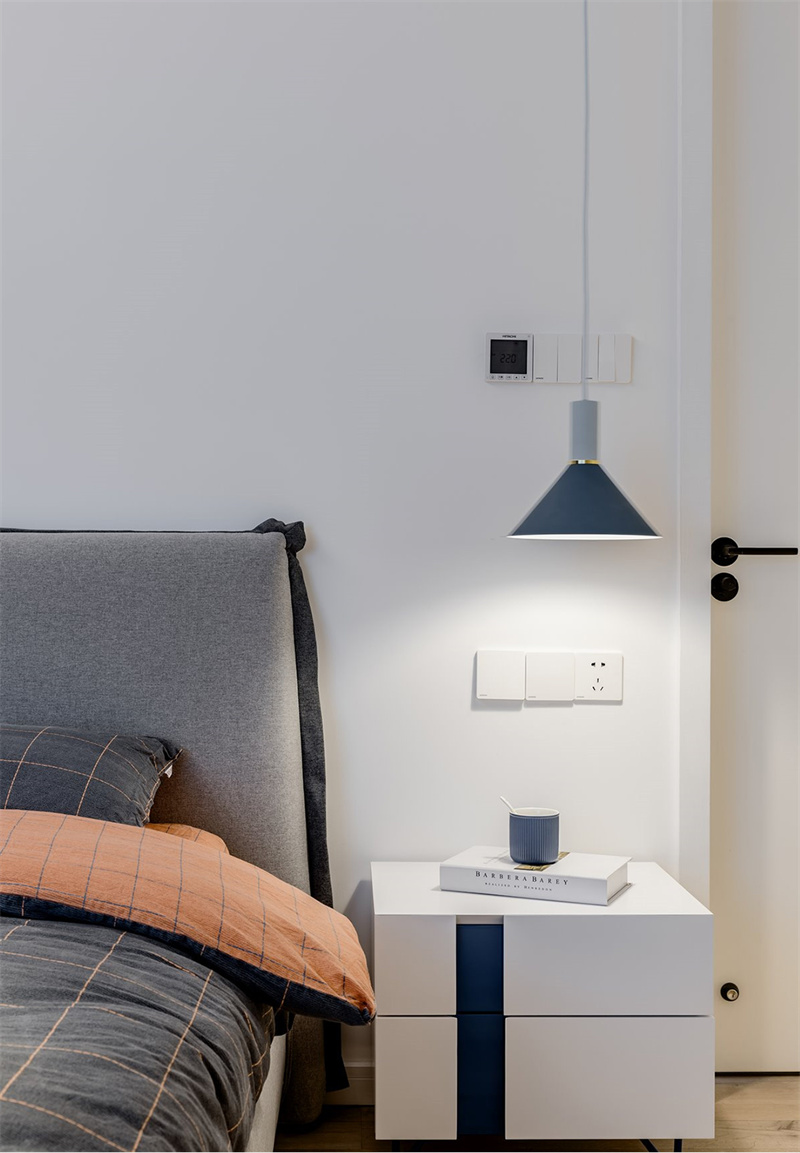 臥室的墻面選擇明亮的白色,增加空間感和提升明亮度。地面采用原木色木質(zhì)地板,為空間增添溫暖和自然感。墻上的智能溫控面板和開(kāi)關(guān)設(shè)計(jì),展現(xiàn)了現(xiàn)代科技與生活的完美結(jié)合,提升了居住的便捷性和舒適度。