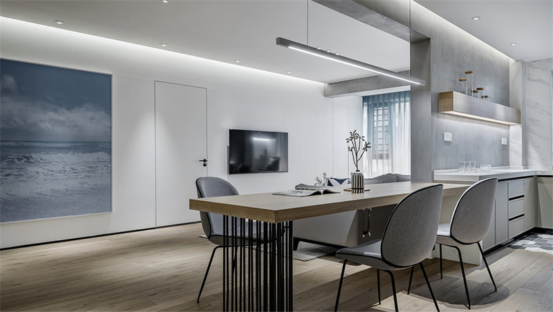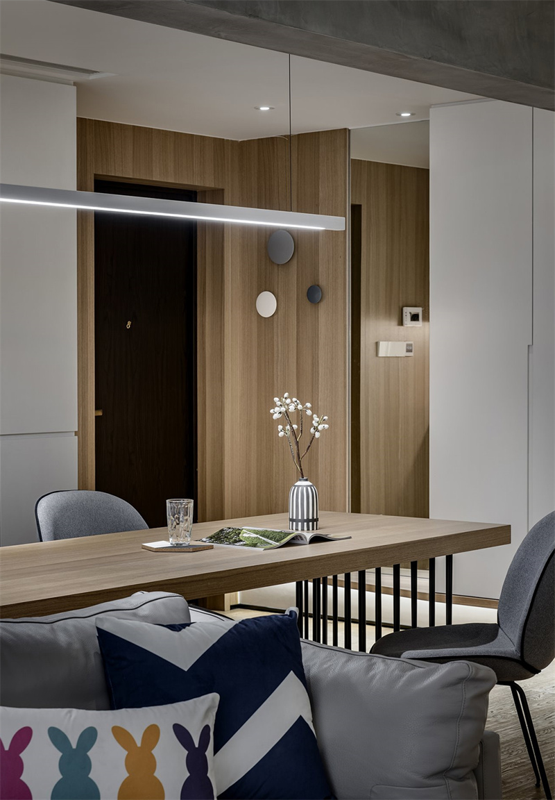 餐廳簡(jiǎn)潔的線(xiàn)條與溫暖的木質(zhì)元素完美融合,營(yíng)造出一種舒適而溫馨的用餐氛圍。長(zhǎng)方形的木質(zhì)餐桌搭配灰色軟墊椅子,背景墻采用大面積的木紋裝飾,不僅提升了空間的層次感,還帶來(lái)了一種自然的溫暖感。
