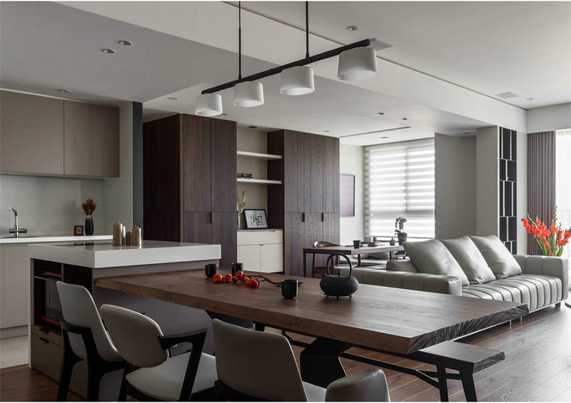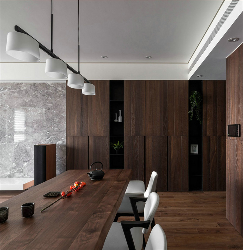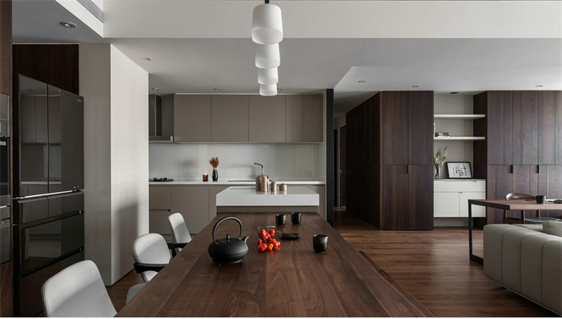 餐廳延續了極簡風格,以簡約的餐桌和現代餐椅為特色,搭配白色定制柜,兼具了裝飾與收納功能,讓空間更加整潔協調,創造一個純凈的用餐環境。