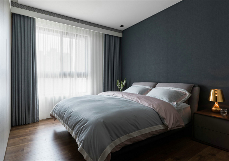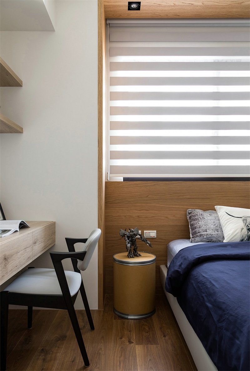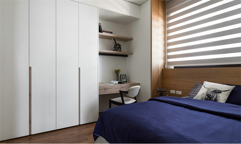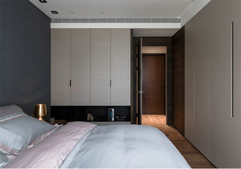 主臥室延續了整體的極簡風格,以原木色和灰白色的搭配為主,消除了多余的裝飾元素。白色的定制柜和藍灰色的床品,為臥室注入了寧靜的舒適感,通過精心設計的照明,讓空間充滿質感和設計感。