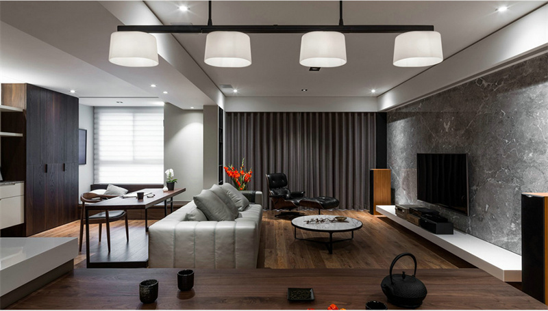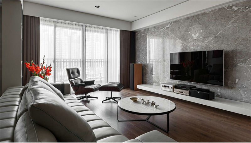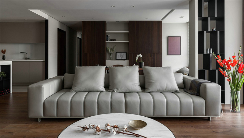 本案裝修以潔凈的灰白色為主,適當加入原木質感的元素,營造出一種自然大方的空間氛圍。布置上簡約舒適的家具、精致的軟裝細節,使得居家空間充滿愜意輕松的感覺。
