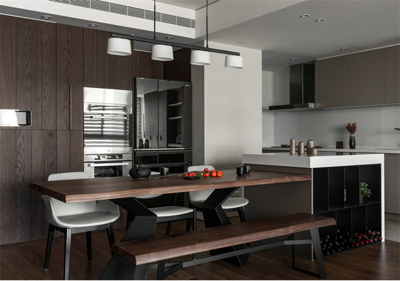 開放式廚房以簡潔和功能性為特點,廚房的中島吧臺與操作臺布局成的操作空間,為主人提供了方便舒適的烹飪場所。優秀的采光條件不僅提供明亮的視線,更是增加了烹飪時的愉悅感。