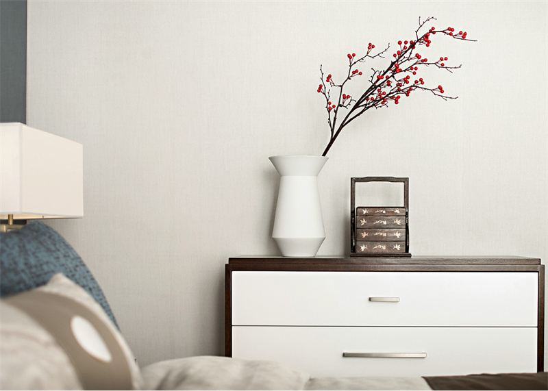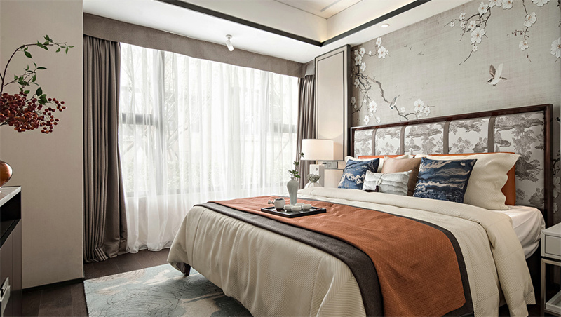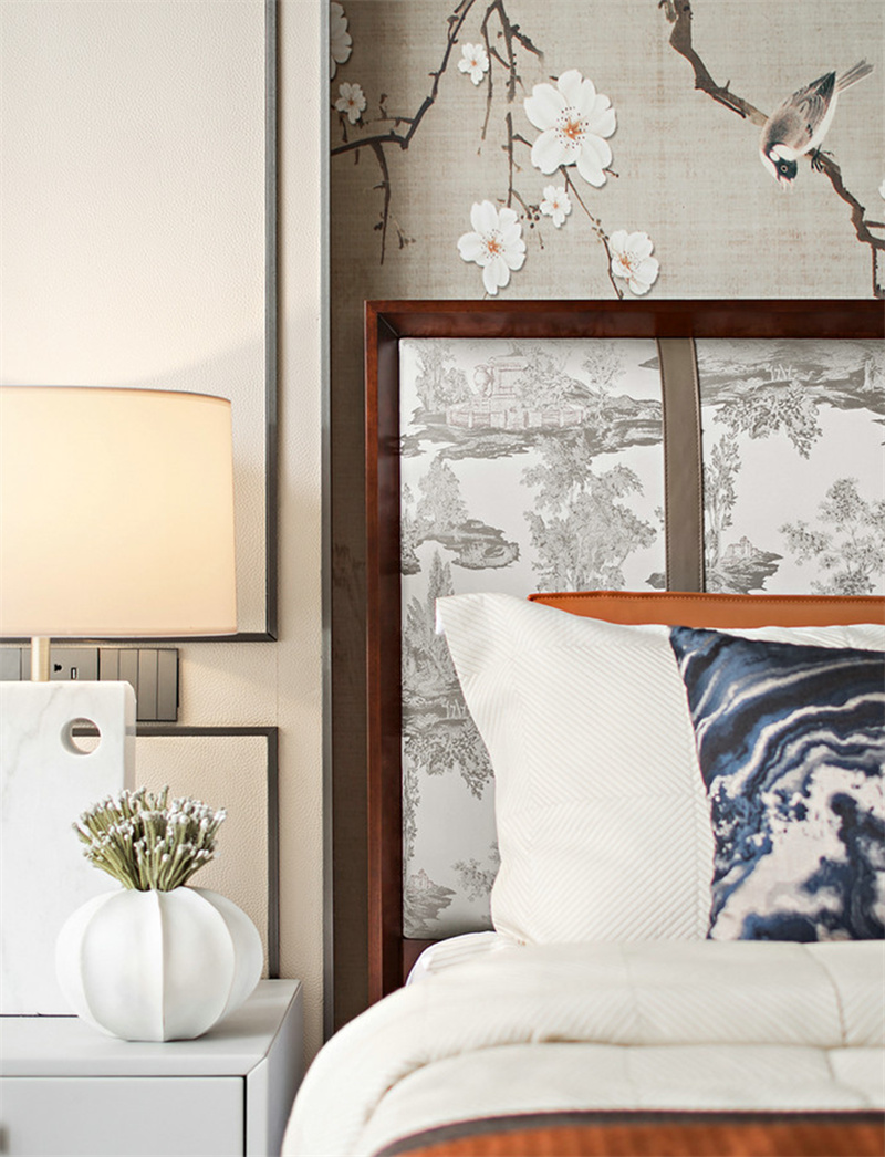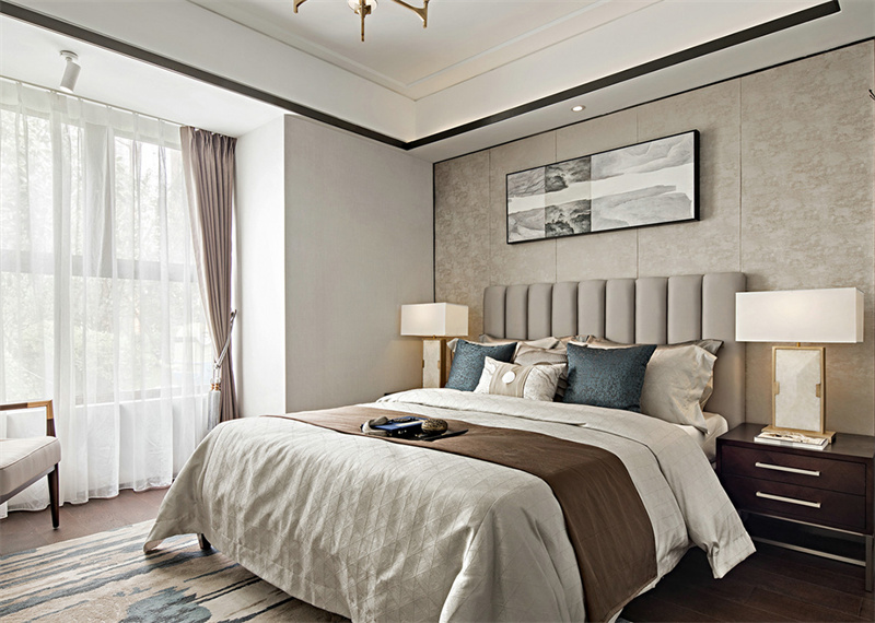 臥室以柔和的中性色調鋪陳,營造出寧靜舒緩的休憩氛圍。床頭大塊面裝飾背景墻奠定空間基調,搭配質感細膩的軟裝陳設——從織物紋理到家具線條,在統一色調中拉開層次,于簡約中見格調。