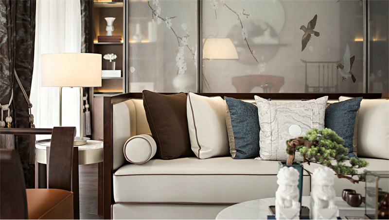 沙發墻在硬包基礎上加入詩意背景畫面,搭配新中式的沙發,側邊配上坐椅、盆栽綠植的布置,使得整個客廳充滿著儒雅端莊的氛圍氣息。