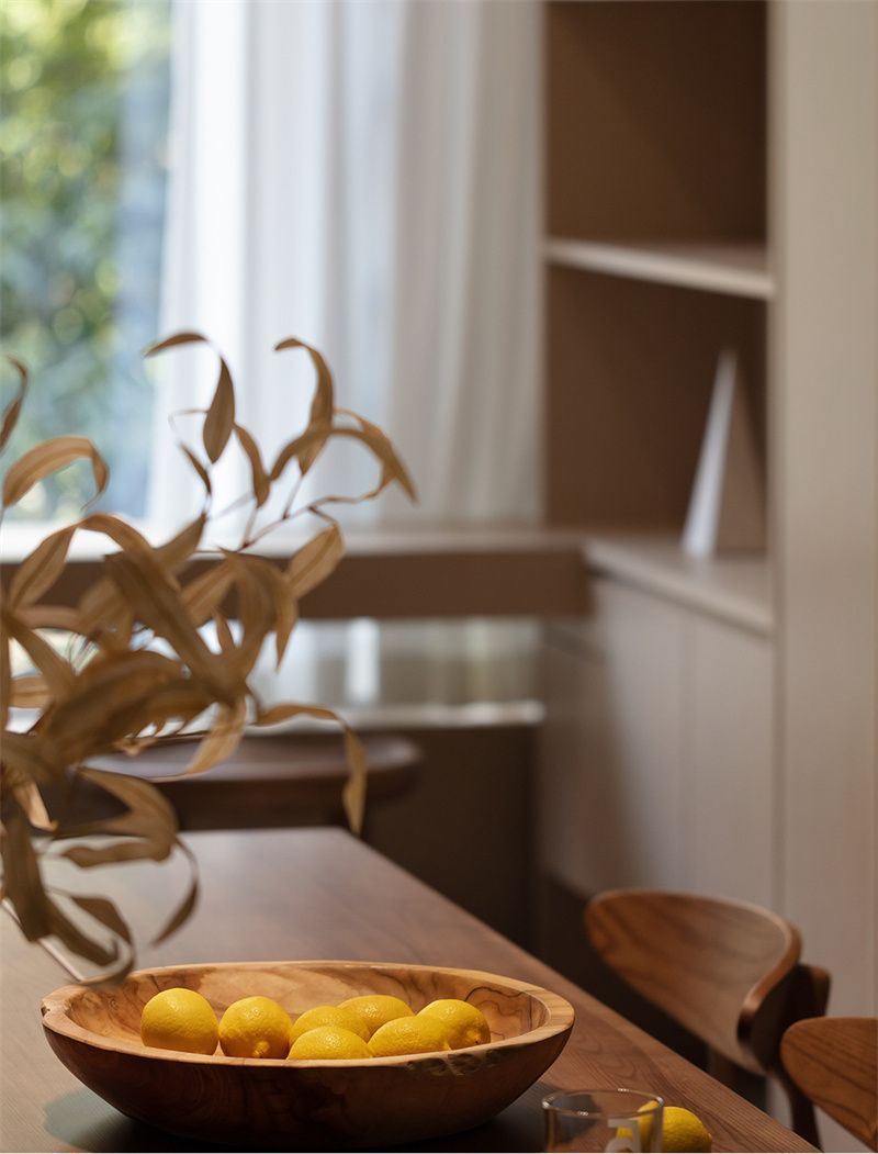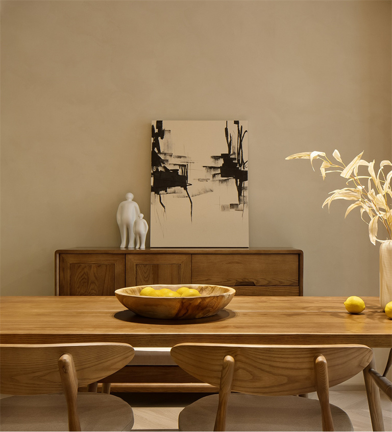 餐廳延續著侘寂美學的靜謐氣質。一張原木色實木餐桌溫潤質樸,搭配線條極簡的軟墊餐椅,沒有繁復的裝飾,只有從庭院隨手采擷的野花在素色陶罐中自然舒展。同色系的餐邊柜靜靜佇立,抽象水墨畫在光影流轉間,勾勒出輕盈而富有禪意的用餐時光。