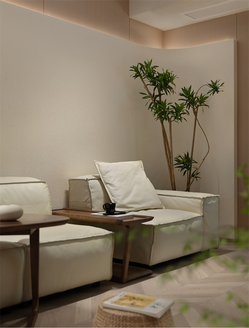 步入客廳,奶油色主調如輕柔的綢緞般鋪展開來,青翠綠植在墻角舒展枝葉,為空間注入自然的生命力。寬大的布藝沙發以柔和的米灰色鋪陳,蓬松的靠墊慵懶地倚靠著,讓人忍不住想要深陷其中,感受這份被溫柔包裹的寧靜時光
