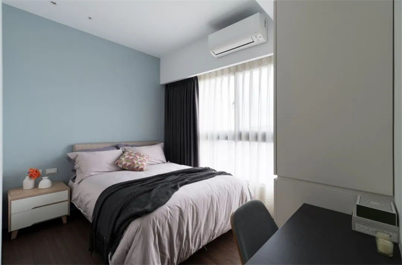 臥室床頭背景墻采用淡雅的淺藍色調,營造出清新自然感。床上鋪著柔軟的粉色床品,搭配幾何圖案的抱枕和灰色毛毯,增添了幾分溫暖與舒適。床頭柜設計簡潔大方,上面擺放著幾件精致的裝飾品和一束鮮艷的橙色花朵,為整個空間注入了生機與活力。