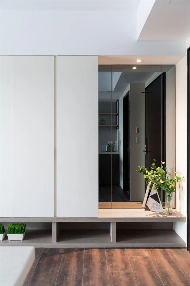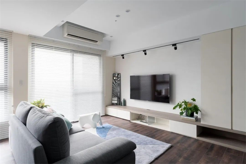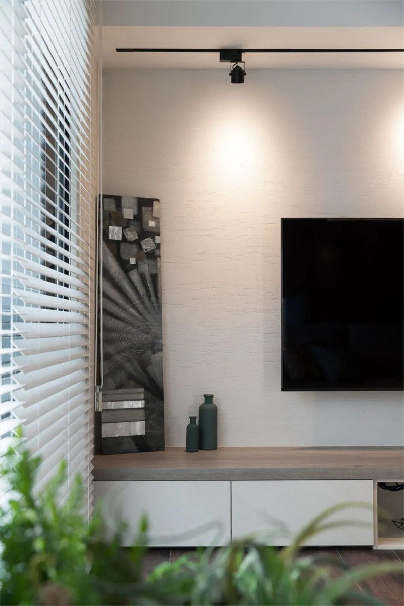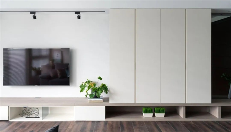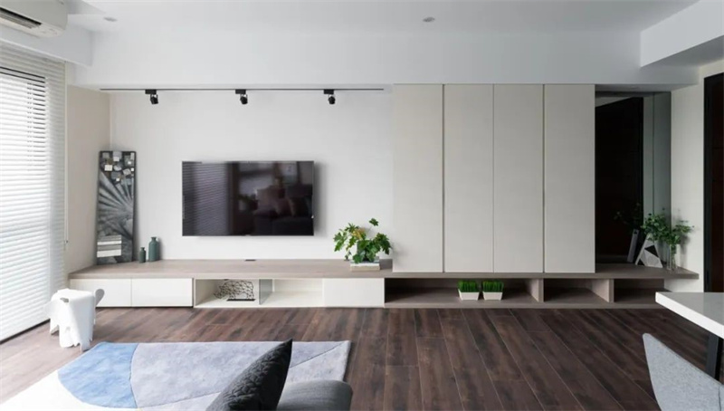 客廳以白色和淺木色為主色調,搭配深色木地板,展現出一種清新自然的北歐風情。大面積的白色墻面和天花板使整個空間顯得更加明亮開闊,懸掛在墻上的電視機成為視覺焦點,下方的木質電視柜設計簡潔大方,既實用又美觀,綠植點綴其間,增添了幾分藝術氣息和生機活力。