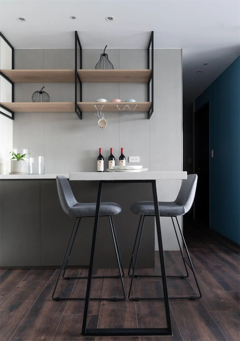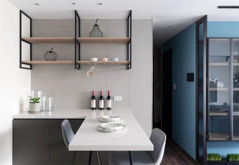 餐廳采用簡潔大方的白色大理石餐桌,搭配灰色布藝餐椅,整體色調和諧統一,帶來極致的用餐體驗。餐桌上方的開放式木質擱架設計簡約實用,不僅提供了充足的儲物空間,還成為展示個性和收藏愛好的小天地。桌面上整齊擺放的餐具和酒品,彰顯了主人對生活的精致追求。