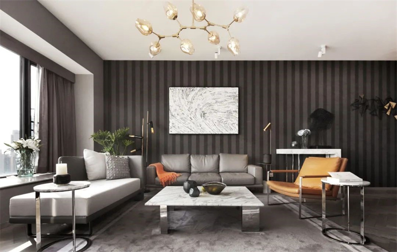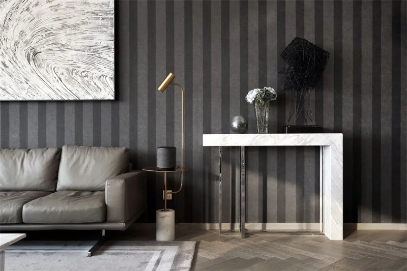 客廳以黑白灰為主色調,搭配木質地板和金屬元素,營造出一種簡潔而高雅的氛圍。背景墻采用豎條格柵設計,不僅增加了視覺上的層次感,還提升了整體空間的質感。墻上懸掛的藝術畫作和雕塑擺件,為客廳增添了幾分藝術氣息和個性魅力。