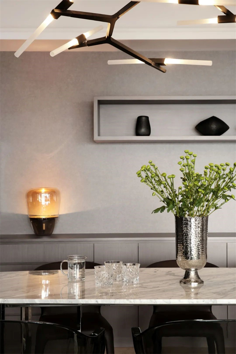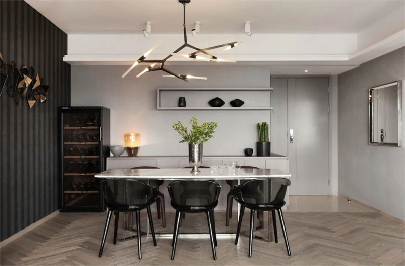 餐廳選用射燈充滿輕盈感,更起到了挑高視覺空間的效果,塑造了大氣、舒適的餐廳環境 。餐邊柜是不能少的,柜子、抽屜、半開放式的設計非常人性化。靠餐廳的一角擺放一個盆栽的綠植,給你不一樣的就餐氛圍。