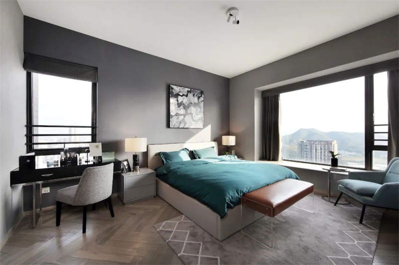 臥室延續了黑白灰的主色調,打造出一個寧靜而富有質感的空間。青色的床品柔軟舒適,簡潔中透出溫馨,床頭兩側的暖色臺燈散發出柔和的光芒,為整個空間增添了一絲溫暖。