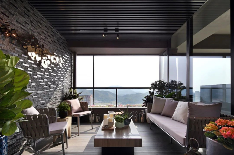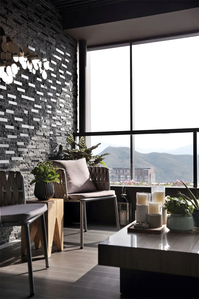 黑色金屬邊框的落地玻璃窗,將室外的光線毫無保留地引入,營造出冷靜而優雅的氛圍。擺放的綠色植物在這單一的色調中尤為突出,為這片寧靜的角落增添了一抹生機與活力,彰顯出現代風格中的自然平衡之美。