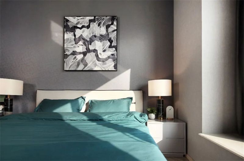 次臥窗簾與另一側的筒燈組成輪廓與線條,背景墻與大幅藝術裝飾畫頓時顯得立體,臥室充滿和諧美感。