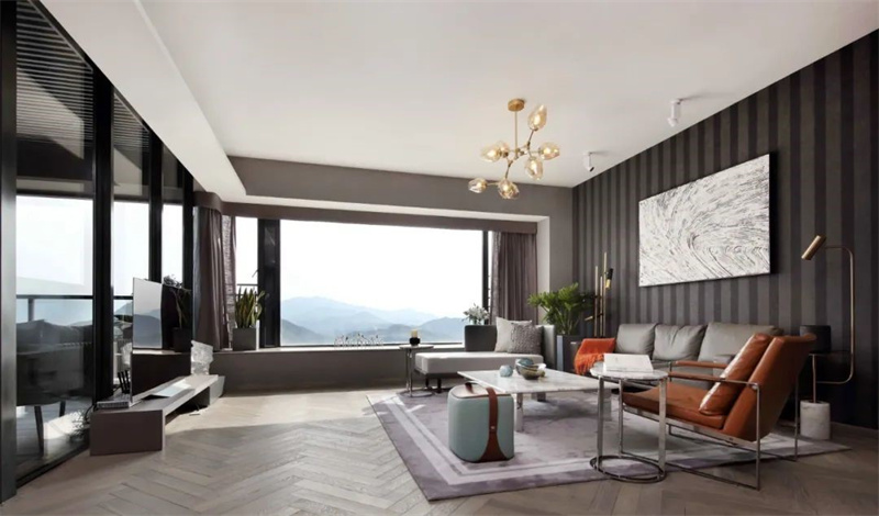 灰色布藝沙發柔軟舒適,搭配橙色單人椅和綠色腳凳,形成鮮明的色彩對比,讓整個空間顯得更加生動有趣。茶幾和邊桌選用金屬框架和玻璃臺面,既美觀又實用,提供了充足的儲物空間。