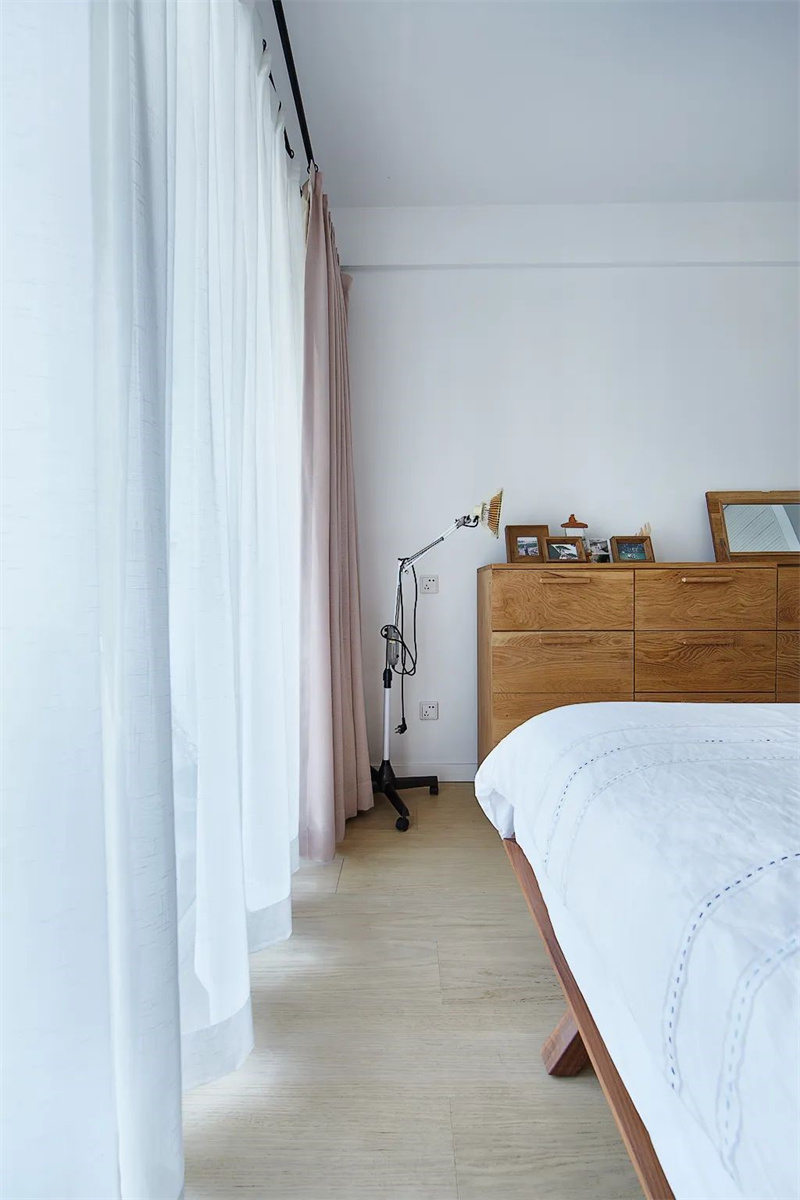 主臥的大飄窗讓人心動,陽光灑入、微風幾許一片歲月靜好,暖色床品、軟裝掛飾搭配,營造出寧靜淡雅的睡眠環境。整體色調偏暖,簡約溫暖舒適,床頭的小臺燈在夜晚照亮屬于自己的小天地。