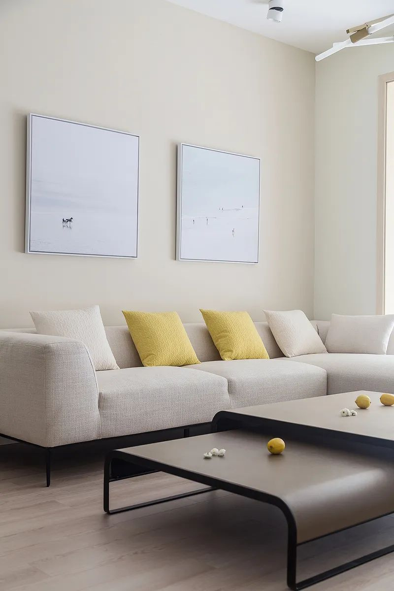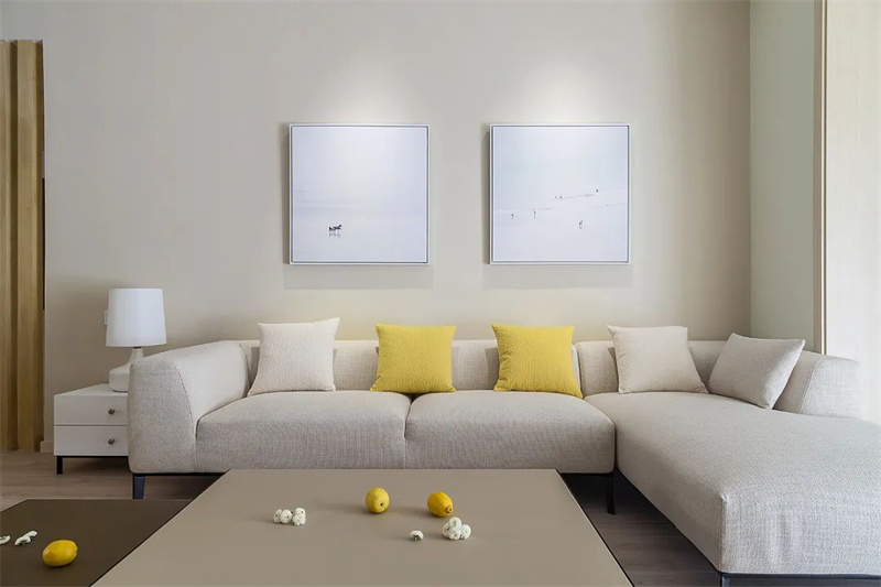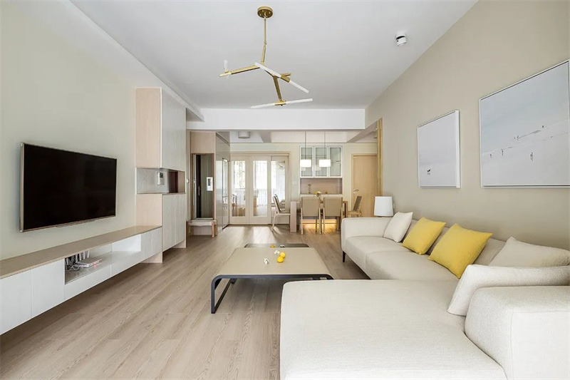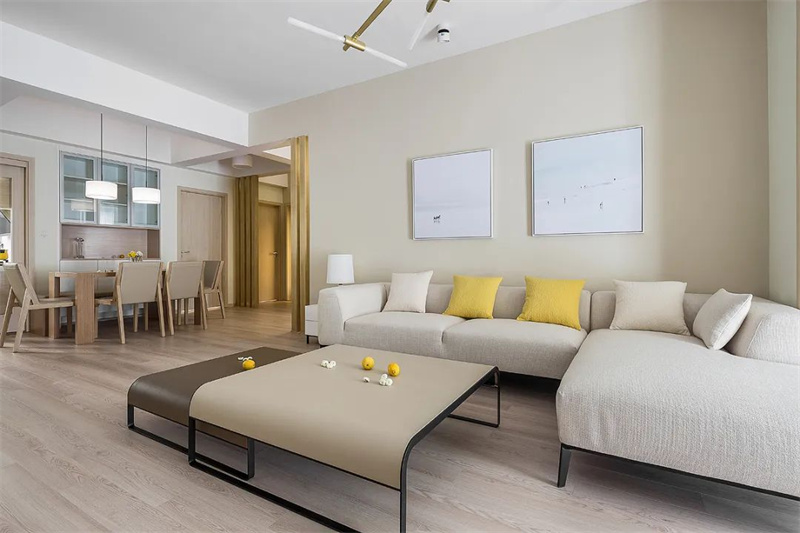 客廳寬敞的空間設計,搭配溫暖的木質地板和簡約的白色沙發,營造出一種舒適而放松的氛圍。金色吊燈增添了幾分時尚與精致。墻上的藝術畫作和黃色靠墊點綴其間,為客廳增添了一抹亮色,帶來一絲活力與生機。