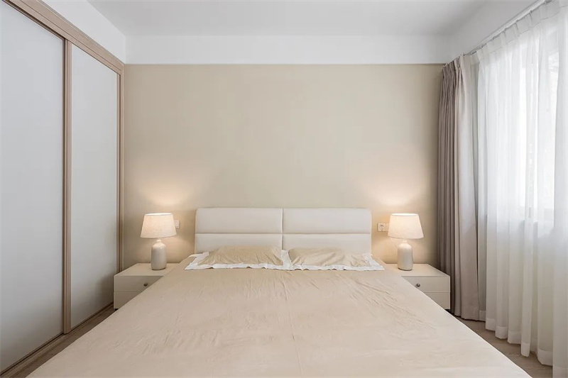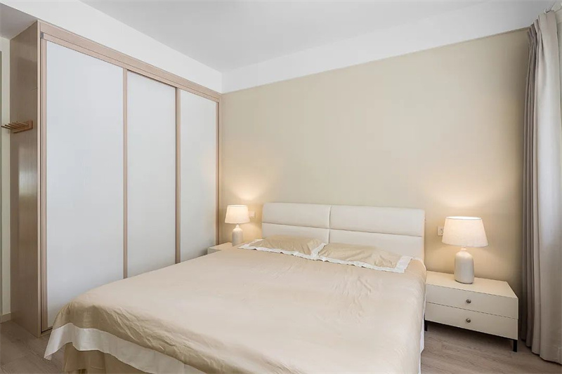 主臥寬敞的大床搭配柔軟的床墊和精致的床上用品,讓人一進入房間便能感受到家的溫暖與舒適。床頭兩側對稱擺放的白色床頭柜和溫馨的臺燈,不僅實用而且美觀,為夜晚閱讀或休息提供了柔和的光線。左側的大型衣柜設計簡潔大方,提供了充足的儲物空間,滿足收納需求。