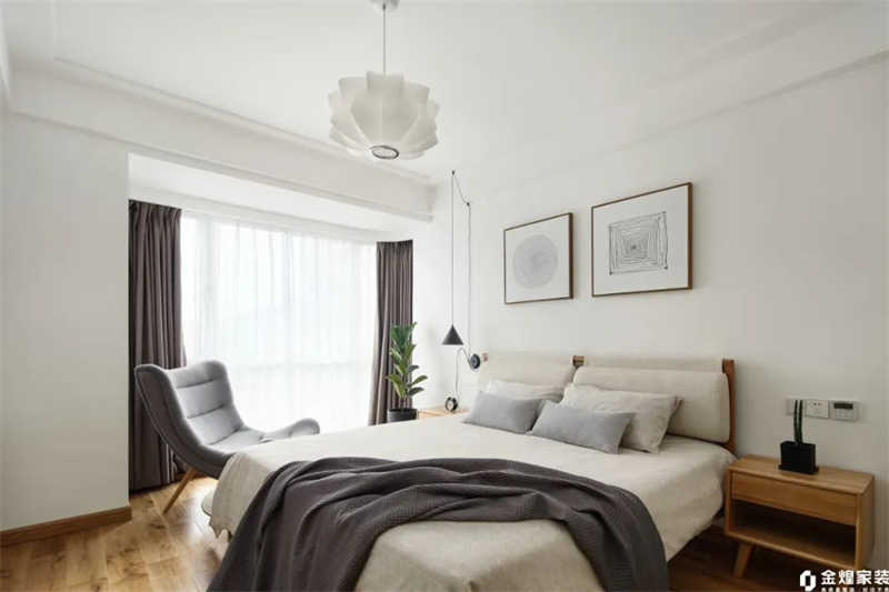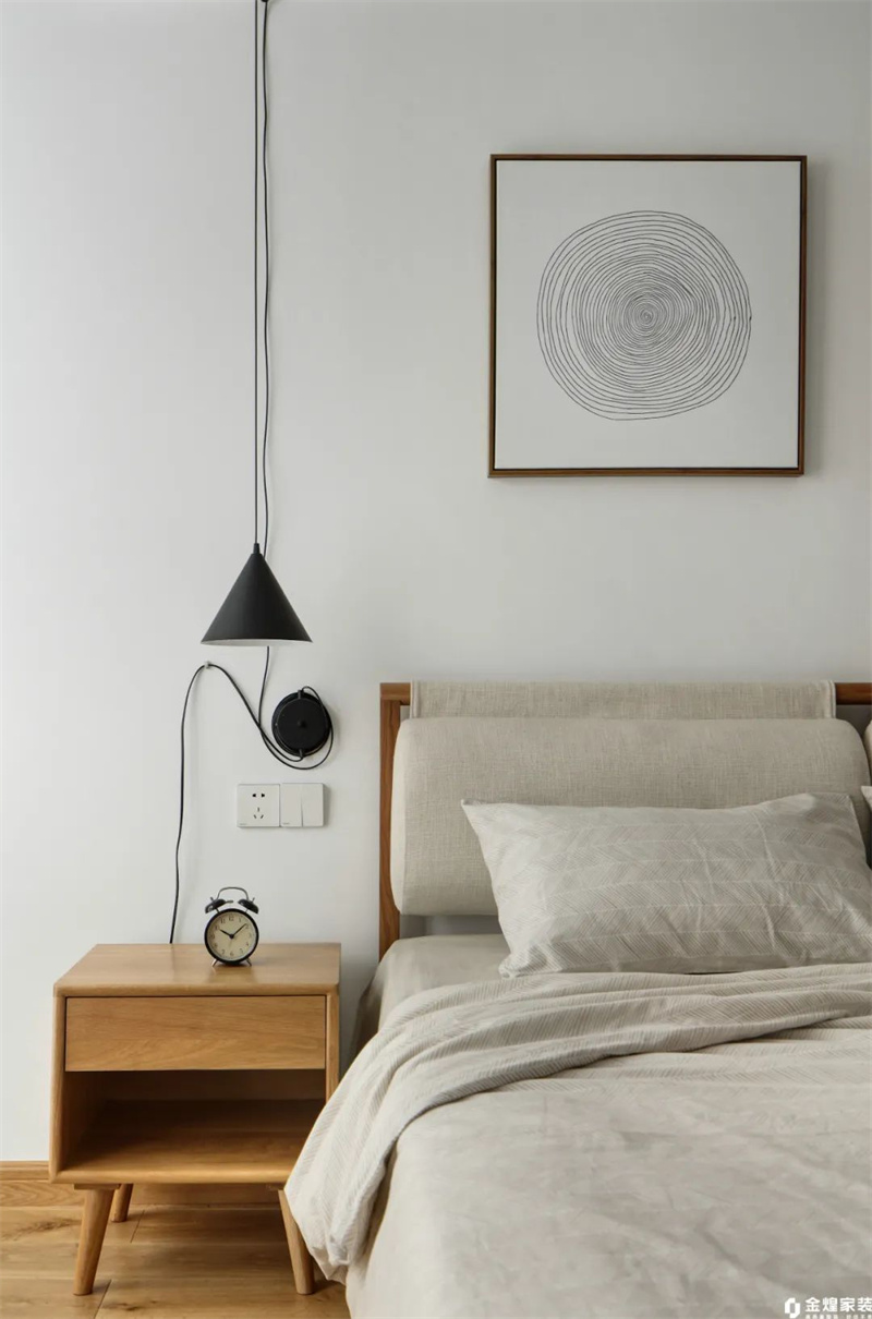 主臥墻面采用淺米色,搭配天然木質(zhì)的藝術(shù)掛畫作為床頭背景,質(zhì)樸自然。簡約的原木床架與柔軟的棉麻床品相互呼應(yīng),讓整個空間充滿舒適感。