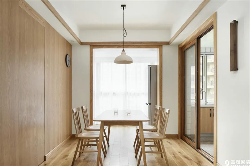 餐廳延續(xù)了原木風(fēng)格的溫潤與自然,木質(zhì)餐桌和椅子以簡潔的線條設(shè)計呈現(xiàn),展現(xiàn)出一種質(zhì)樸而不失現(xiàn)代感的美。柔和的燈光灑落在餐桌上,營造出舒適且溫暖的用餐氛圍。
