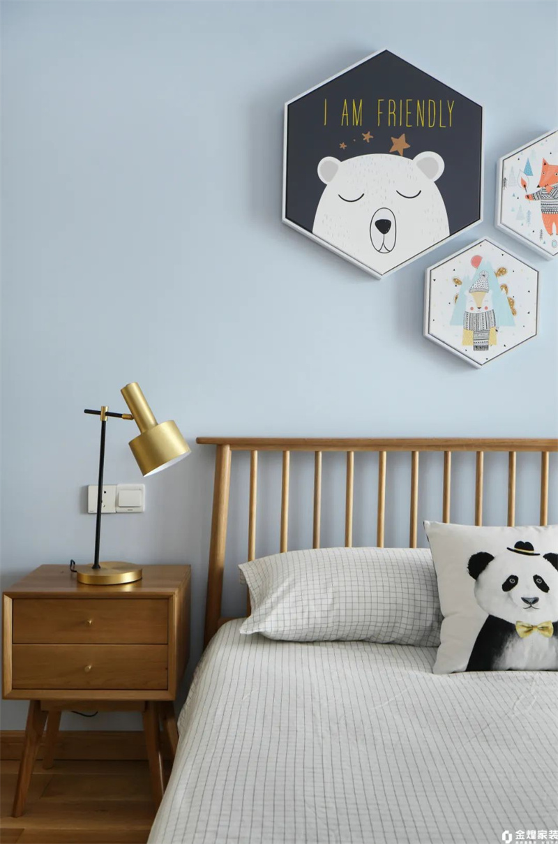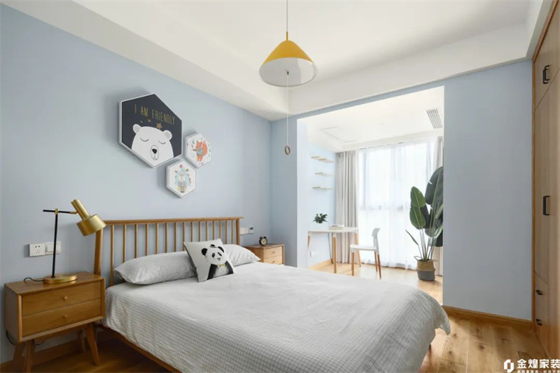 兒童房在原木風(fēng)格的基調(diào)上,加入了更多活潑明快的元素。陽臺光線明亮,陽光灑滿整個空間,使房間充滿了溫暖和生機(jī)。陽臺一側(cè)設(shè)置了一張簡潔的原木書桌,書桌靠窗,孩子可以在自然光下進(jìn)行學(xué)習(xí)和閱讀,充分享受清新的室外景色。