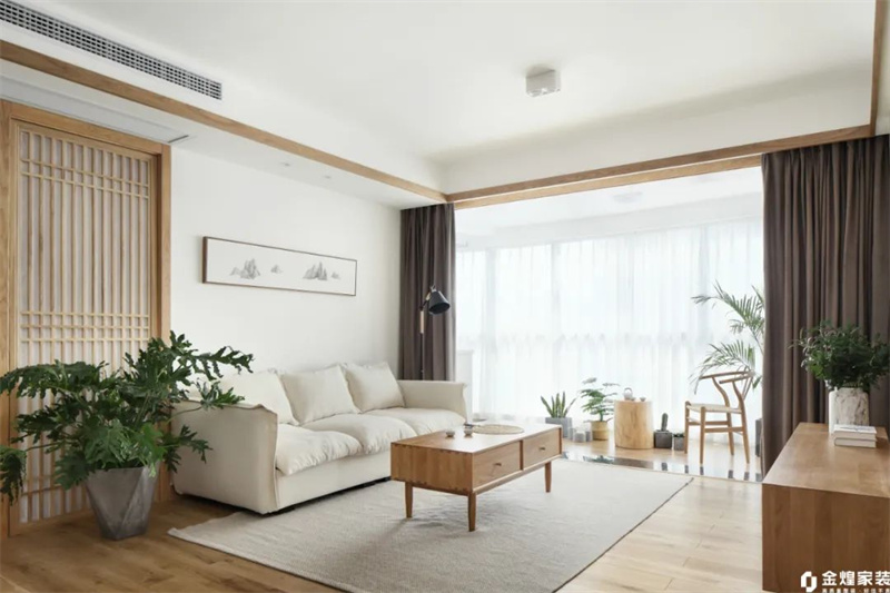 原木風(fēng)格的客廳以舒適的布局為基調(diào),使用大面積原木色與白色結(jié)合。奶白色的墻面搭配色彩樸素的軟裝飾品,再加上綠植和一盞落地?zé)簦臒艄庋b飾,營造出一個溫馨的氛圍。
