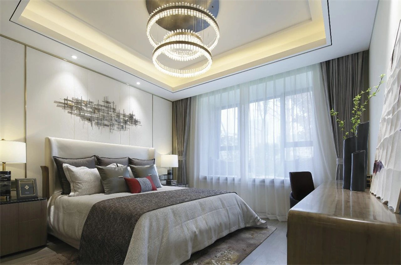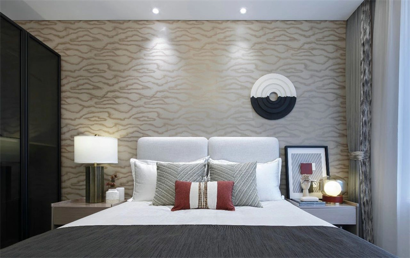 傳統的中式元素與現代的簡約設計完美結合,呈現出典雅與舒適的空間氛圍。床頭背景設計了一幅大型藝術背景裝飾,為整個房間增添了一份藝術氣息。大窗戶讓自然光線充盈房間,這樣的主臥空間,不僅是休憩的港灣,更是文化與現代生活的完美融合。