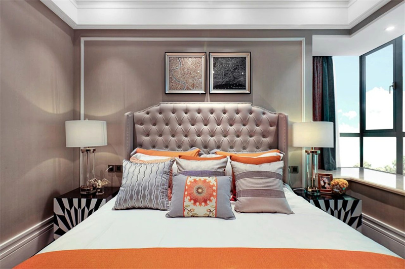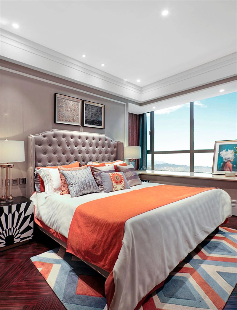 主臥中,優(yōu)雅與奢華交織成了一幅夢幻的畫卷。床頭采用軟包設(shè)計,柔軟的天鵝絨床品與大飄窗相互呼應(yīng),金屬邊框的鏡子與床頭柜上簡約的臺燈為臥室增添了一絲現(xiàn)代感,同時保持輕奢的調(diào)性,使空間既舒適又不失格調(diào)。