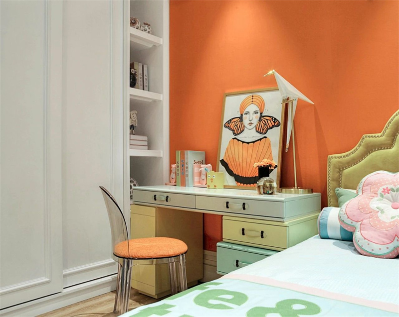 兒童房充滿溫馨與活力,設(shè)計簡潔卻極具趣味性。房間的主色調(diào)以橙色為主,配合原木色地板,營造出輕松愉快的氛圍。床頭設(shè)置了一張書桌,陽臺明亮的光線灑入室內(nèi),為孩子提供了理想的學(xué)習(xí)和游戲區(qū)域,增添了童趣和活力。