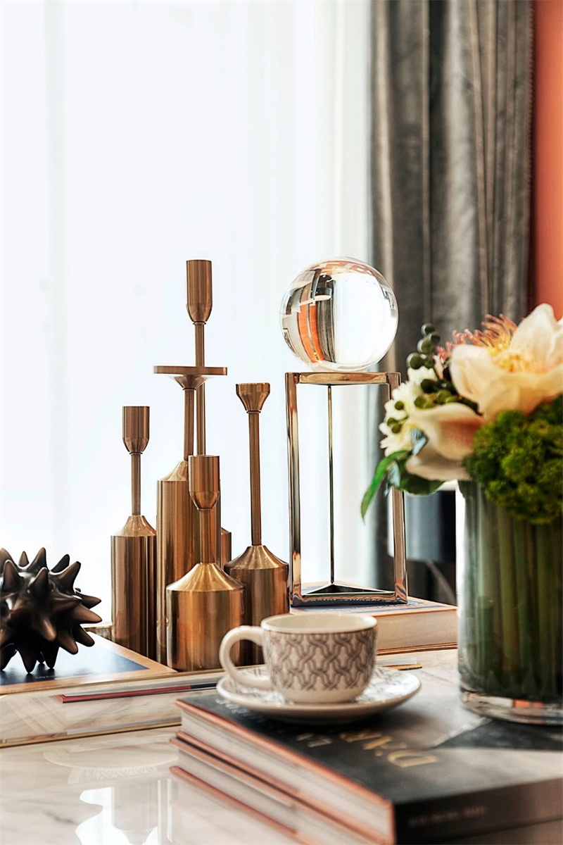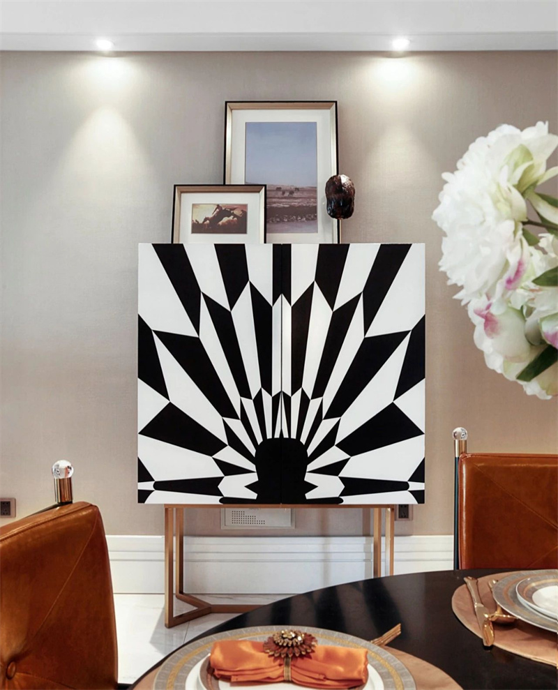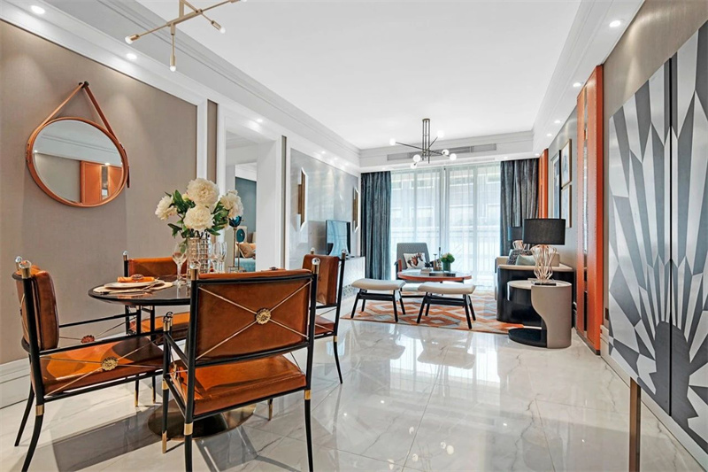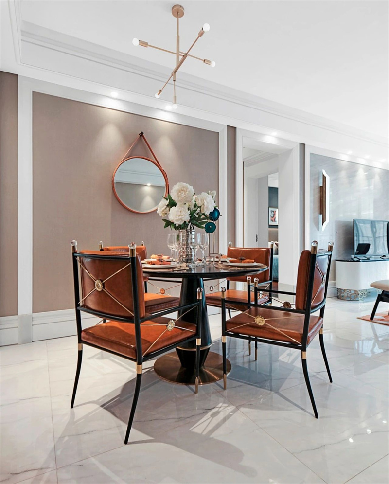 餐廳設(shè)計講究細(xì)節(jié)與品質(zhì)的融合。中央的餐桌簡潔大氣,圍繞它擺放著幾張極具辨識度的愛馬仕橙色餐椅,與同色系的裝飾品相互呼應(yīng),為餐廳增添了一絲活力和時尚感。餐桌上精致的餐具與花藝裝飾,為每一餐的時光賦予滿滿的儀式感。