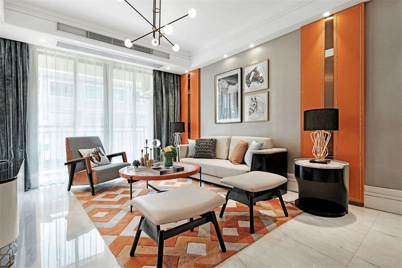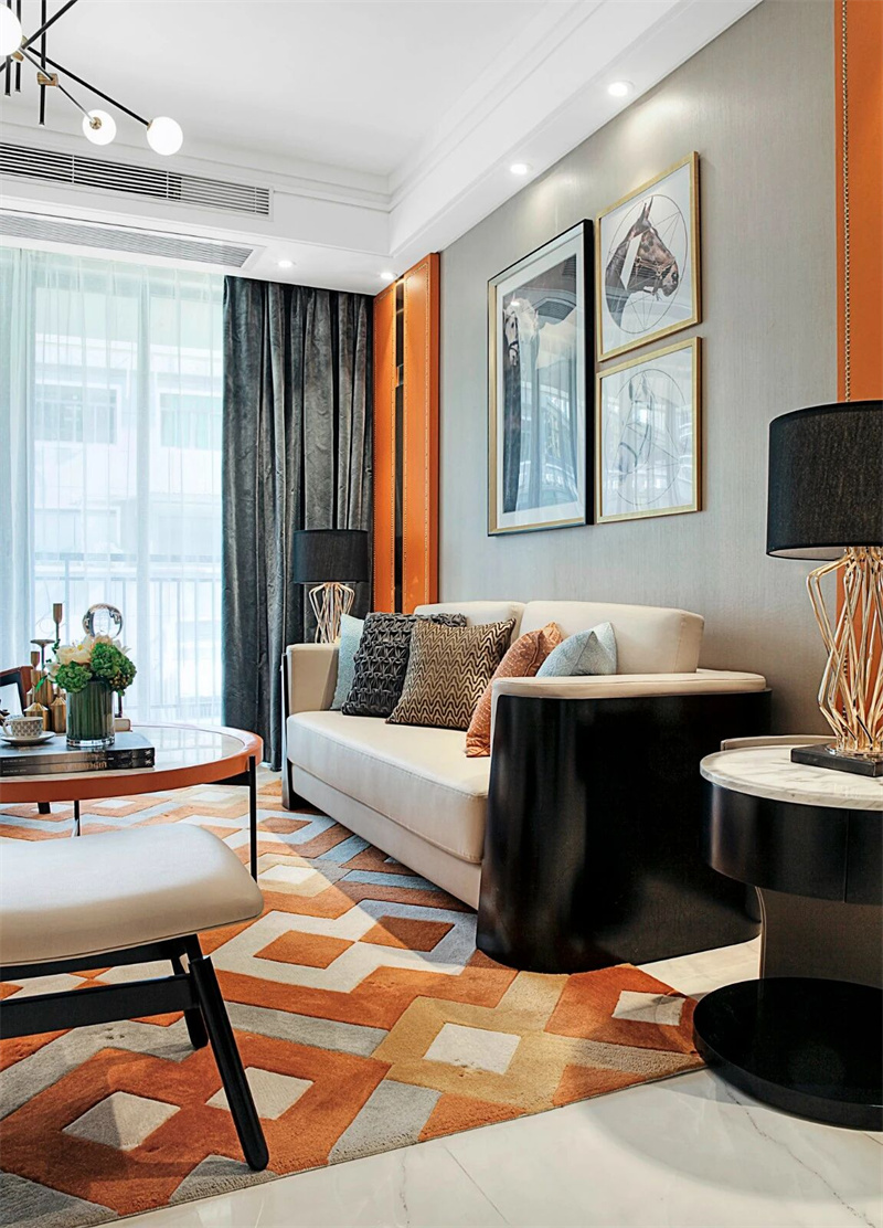 客廳的設(shè)計完美詮釋了法式輕奢的精髓,一張極具視覺沖擊力的愛馬仕橙色地毯鋪陳于大理石地面上,與淺米色的沙發(fā)和金屬質(zhì)感的茶幾形成鮮明對比,營造出層次分明的視覺效果。柔和的燈光與古典裝飾掛畫,為整個空間增添了一份溫暖的浪漫氛圍。