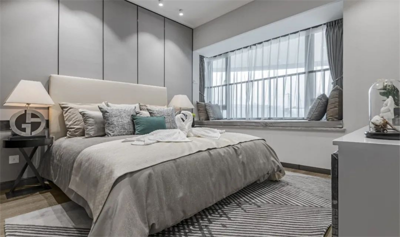 臥室精心挑選了高品質的床具,柔和舒緩的色調給人寧靜的感覺。搭配柔軟舒適的床品和軟裝,保證了睡眠質量。同時,考慮到大空間的照明需求,臥室布置的燈具都以溫柔的意象為主題,為空間營造了貼心的守護感。