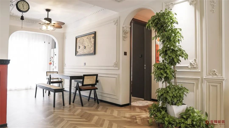 業主喜愛古典與現代元素的結合,追求優雅、浪漫的居家氛圍。女主人更是對于清雅的綠色情有獨鐘,不僅在硬裝上大面積選用了濃郁的墨綠,還希望借助中古風情的家具和配飾進行撞色搭配,打造浪漫、優雅的法式復古風格。