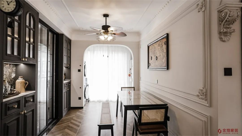 全屋整體配色以大面積的墨綠與棕咖調相結合,再搭配具有復古韻味的家具。在精致的燈飾映襯下,法式情調和復古氛圍在空間中得以巧妙融合。寬廣的飄窗帶來極佳的采光,使整個公共區域充滿通透感,舒適明亮。